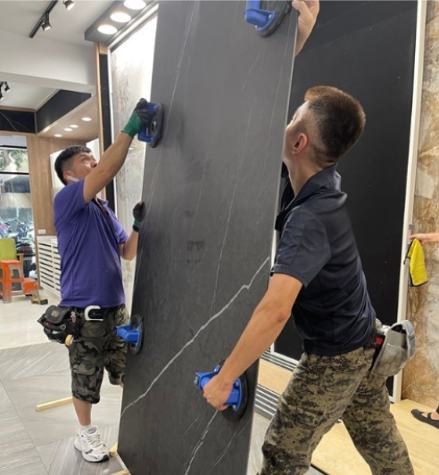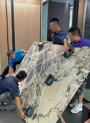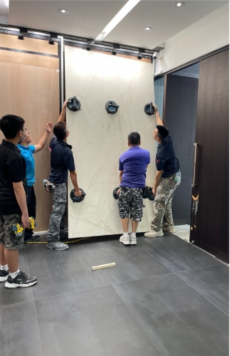 而施工團隊經驗更是每年總共經手超過300個案場,施工過程由事前丈量估價、專車運輸、電動吸盤輔助搬運、現場加工或送加工廠加工,施工黏貼大板磚、石材美容膠填縫、完工保固延長至五年,一條龍式服務,消費者不再為沒有工班而煩惱,讓您選擇大板磚後更便利更有保障。