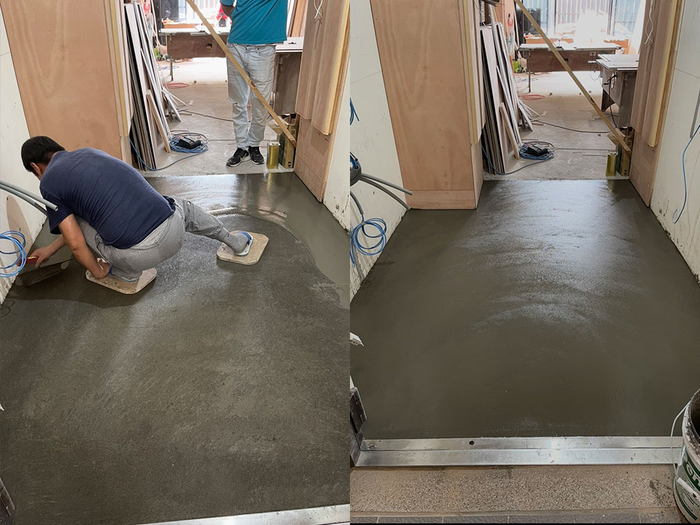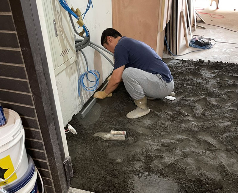師傅在地面鋪設水泥砂漿,為後續鋪設地磚或薄板磁磚的基礎層。