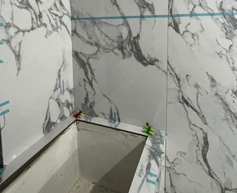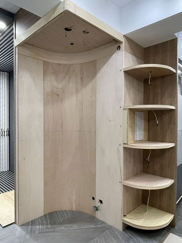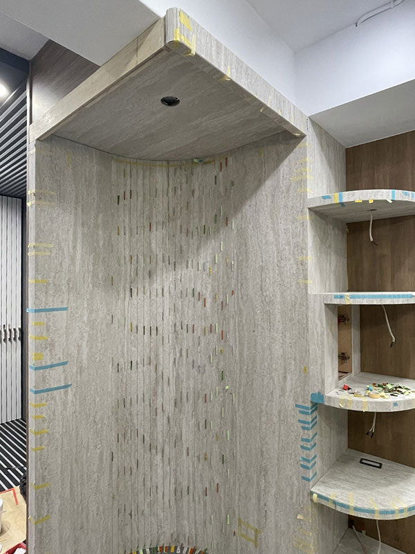 ![]() | 木作基底 結構穩定度與弧形精準度,作為後續薄板磁磚或飾面貼覆的基礎。所有薄板磁磚皆需點膠固定牢靠,以確保成品耐久與安全。 |
