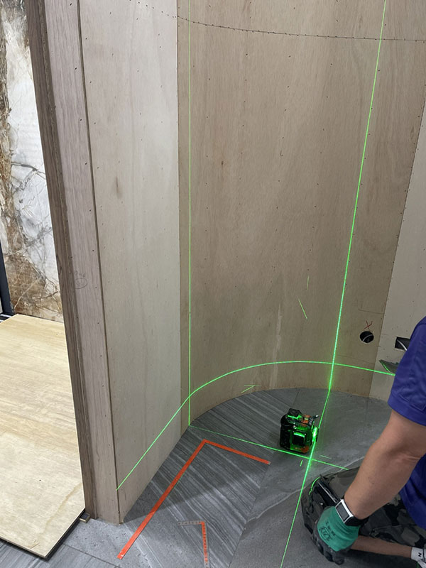 | 雷射水平垂直-校正放樣 使用雷射水平儀進行牆面與地坪的垂直、水平定位放樣,確認曲面牆體中心線、垂直基準線與地坪弧度是否準確。確保後續薄板磁磚黏貼筆直、對稱一致。 | ![]() |