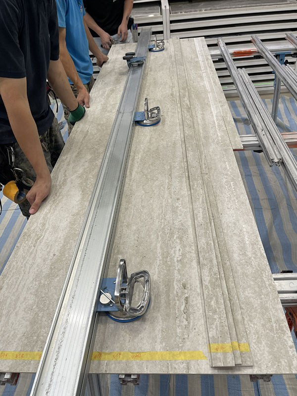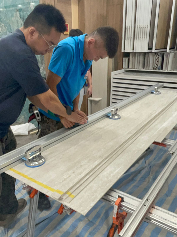 師傅使用軌道式切割機,在工作檯上對薄板磁磚進行直線裁切,並用吸盤與支架固定另一人協助切割設備或支撐架,確保加工順利。