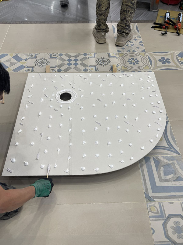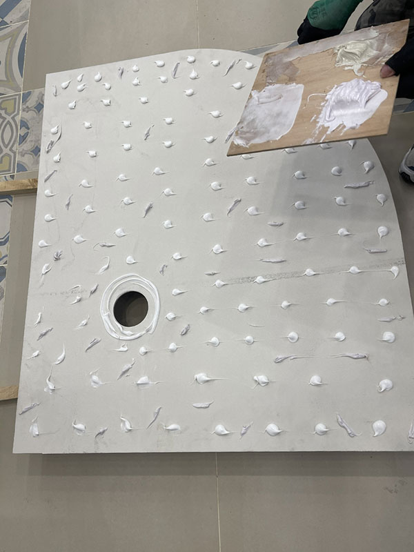 | 磁磚開孔處補強塗抹 針對磁磚開孔處進行補膠。此步驟能降底開孔處日後破裂的風險,讓整體貼合密度提高,補膠能減少因薄板磁磚開孔處原有解構產生變異,加固脫落風險,是高品質施工的重要細節。 | ![]() |
