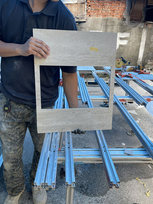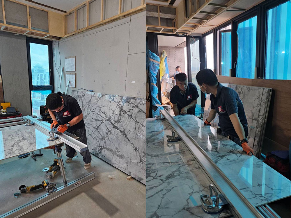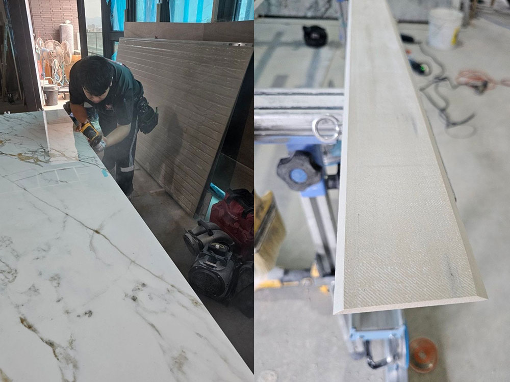 | 薄板磁磚-直線裁切 透過導軌工具固定磁磚後進行裁切,確保邊緣平直、尺寸符合設計需求。此工法常用於大尺寸磁磚、牆面包覆與特殊造型設計,可提升整體施工精度與完成品質。 | ![]() |