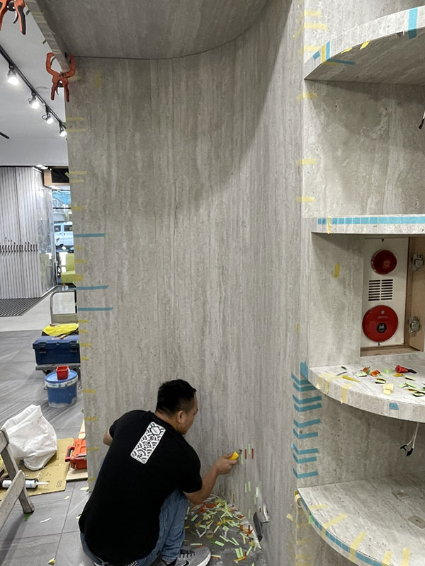 | 定位黏貼 將已加工完成的薄板磁磚安裝於木作牆體結構上,師傅同步進行水平與深度調整,確保磁磚穩固、弧度貼合牆面。 | ![]() |