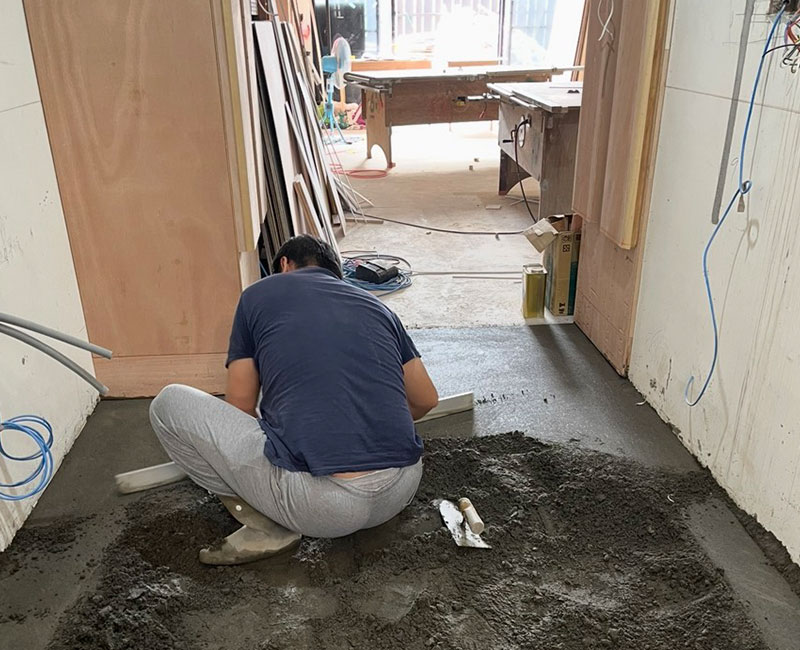 將剛鋪設的水泥砂漿,填補凹陷、刮除凸起,使地面保持平整。