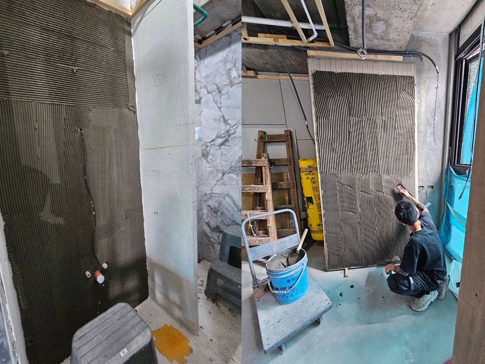 師傅將帶有梳齒紋路的水泥黏著劑塗抹於牆面,有助於提升磁磚的黏著效果。