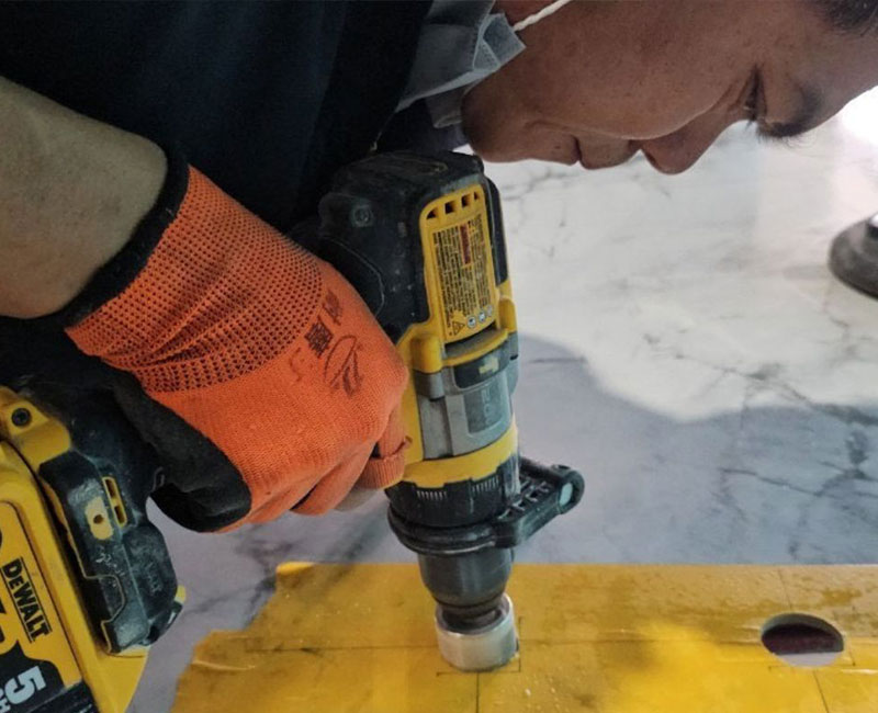 師傅使用電鑽與開孔器,在薄板磁磚上精準鑽孔,是為了預留水管、電線等位置。