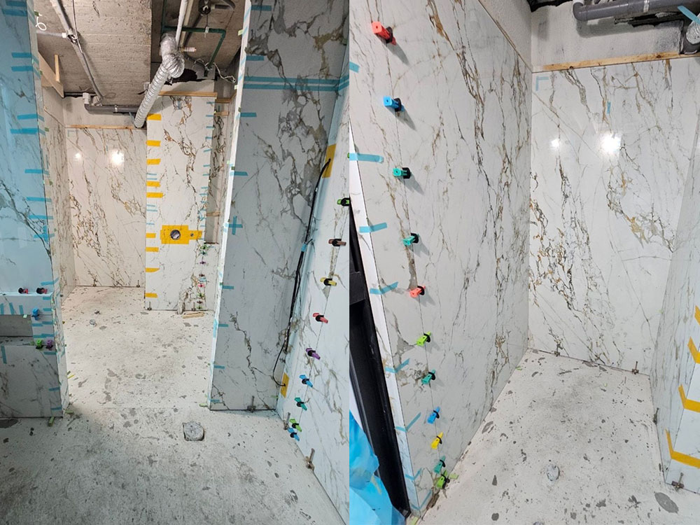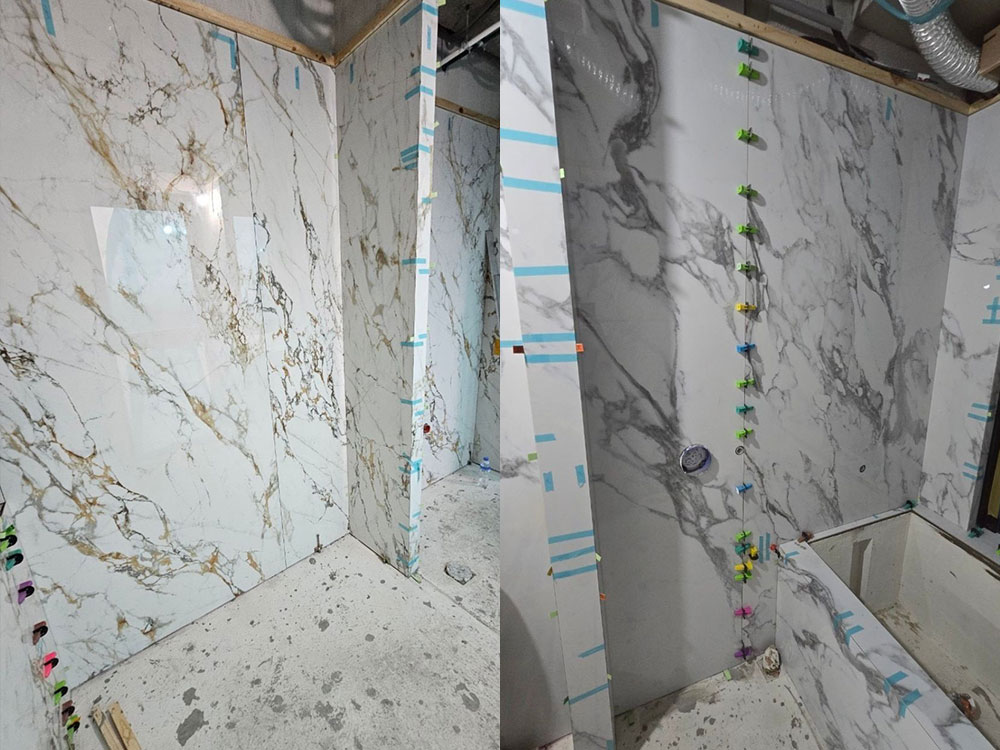 而且薄板磁磚因本身尺寸大可大量減少縫隙,讓視覺效果更一致,且後續填縫工程均採用與石材美容填縫等級的美容膠填縫處理方式,讓薄板磁磚整體呈現更接近天然大理石。